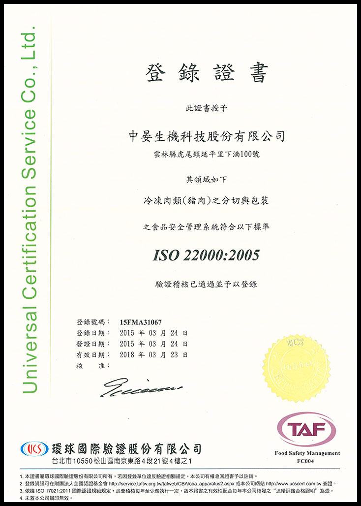 已取得ISO 22000(食品安全管理系統驗證)驗證。參照HACCP的驗證原理,並融合GMP(食品良好操作規範)與GHP(食品良好衛生規範)的精神。