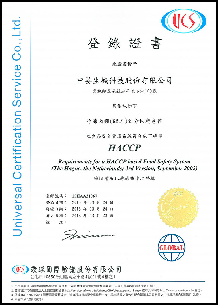 中晏雲林廠已通過HACCP(危害分析與重要管制點)的驗證,使雲林廠之食品製造過程均依HACCP制度執行產品品質保證系統,發揮「食品安全保證」之主要功能。