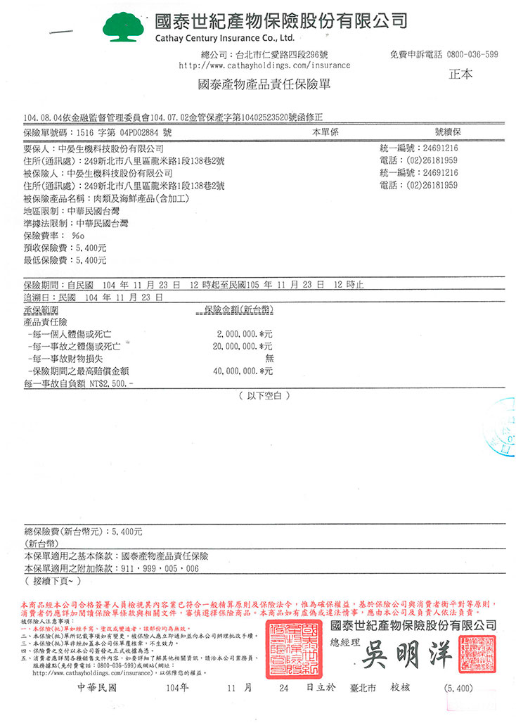 中晏所有產品已投保產品責任險4000萬,讓您更放心食用中晏產品。